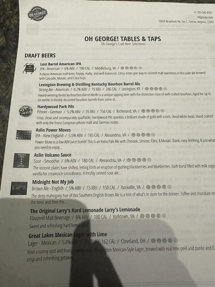 Oh George! Tables & Taphouse is a casual yet classy restaurant offering a range of amenities and services like outdoor seating, waiter service, and free Wi-Fi. Located in Fairfax, VA, it provides a cozy atmosphere for groups, kids, and even dogs. Customers rave about the attentive service, quality food, and diverse craft beer selection. The menu features delicious dishes like honey-glazed salmon, steak, and pulled pork sandwiches. With a relaxing ambiance and accommodating staff, Oh George! Tables & Taphouse is perfect for a lunch or dinner gathering. Whether you're looking for a chill hangout spot or a place to host an event, this restaurant has got you covered. Make sure to stop by for a memorable dining experience!